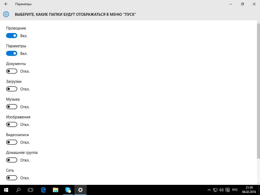 Ниже имеется ссылка «Выберите, какие папки будут отображаться в меню «Пуск». Если кликнуть по ней, то откроется окно, в котором можно включить или отключить для показа в меню «Пуск» папки: