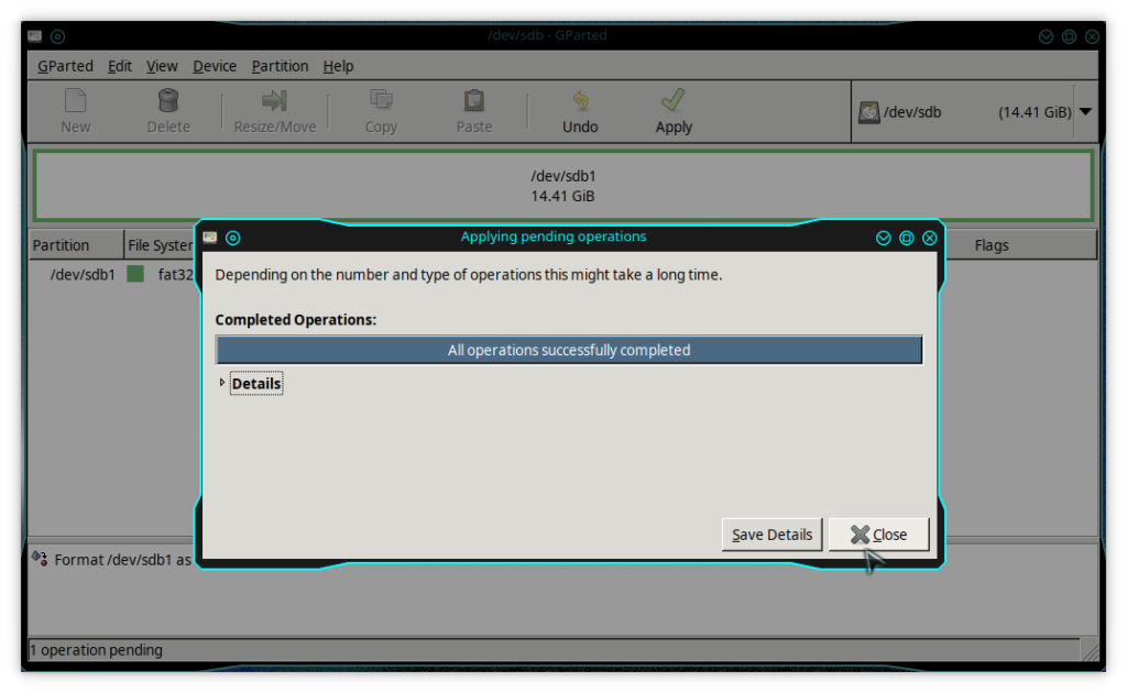 После завершения форматирования флешки она станет не только полностью свободна, но и приобретет указанный ранее формат файловой системы, что будет полезно при дальнейшей работе с ней. Единственный недостаток этого варианта заключается в том, что программа Gparted не входит в стандартный набор обеспечения, а для ее установки потребуется активное подключение к интернету.