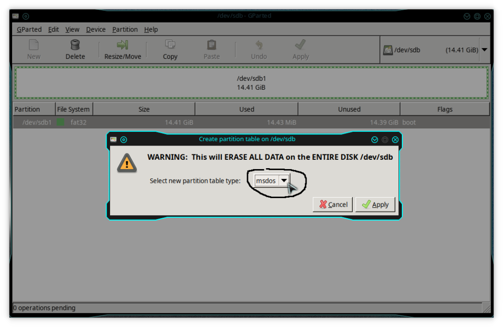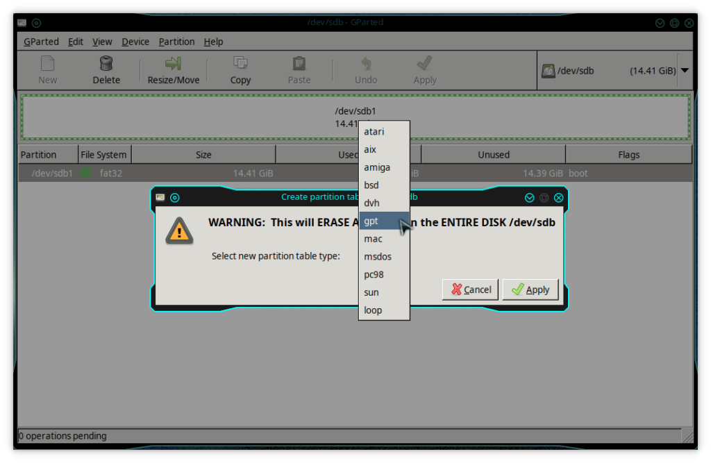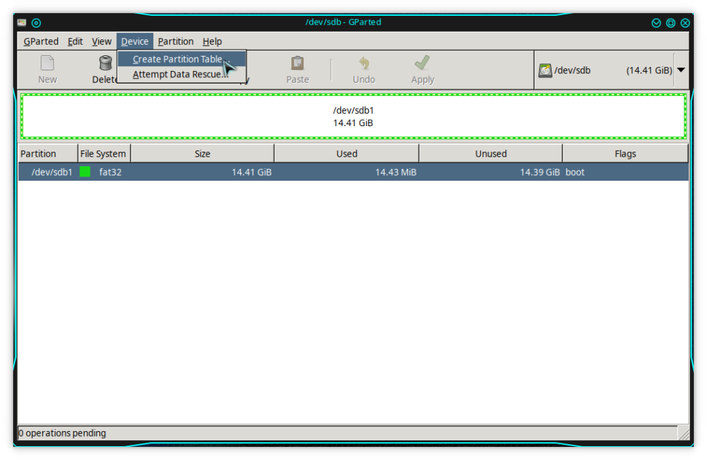 Выбор Ваша карта с интерфейсом USB из выпадающего меню GParted> Devices. Затем нажмите вкладку «Device»>, Создают Таблицу разделов…
