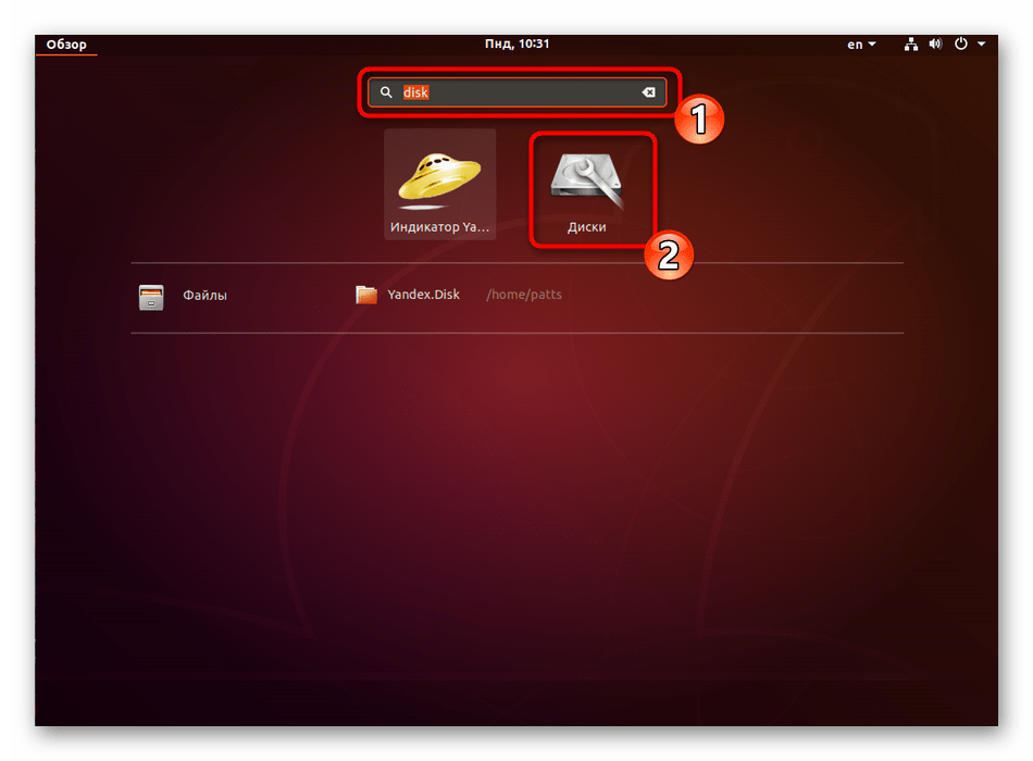 - Откройте меню и через поиск найдите инструмент «Диски» или «Disk Utility». Запустите программу двойным щелчком ЛКМ по ее значку.