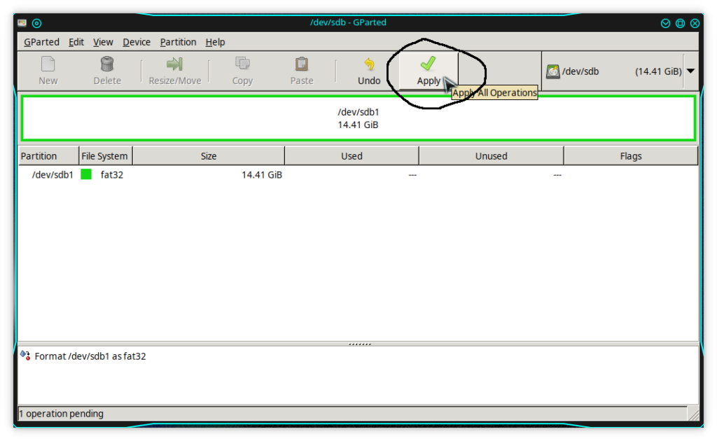 не забывают применять Вашу конфигурацию путем нажимания зеленой кнопки «проверки» в GParted.