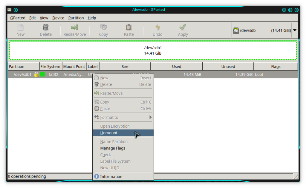 Ищем нашу флешку в списке доступных дисков и нажимаем на кнопку в виде куба (Unmount selected partition). Так мы отключим ее от файловой системы компьютера.