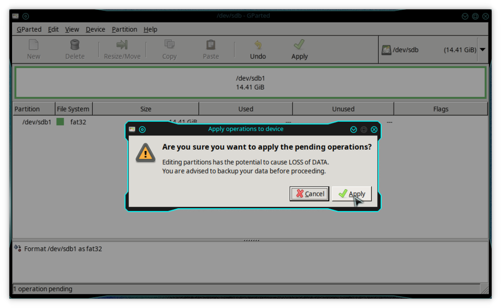 После выполнения этих действий в разделе Edit требуется нажать Apply для применения изменений. Флешка отформатирована, следующий шаг можно опустить.