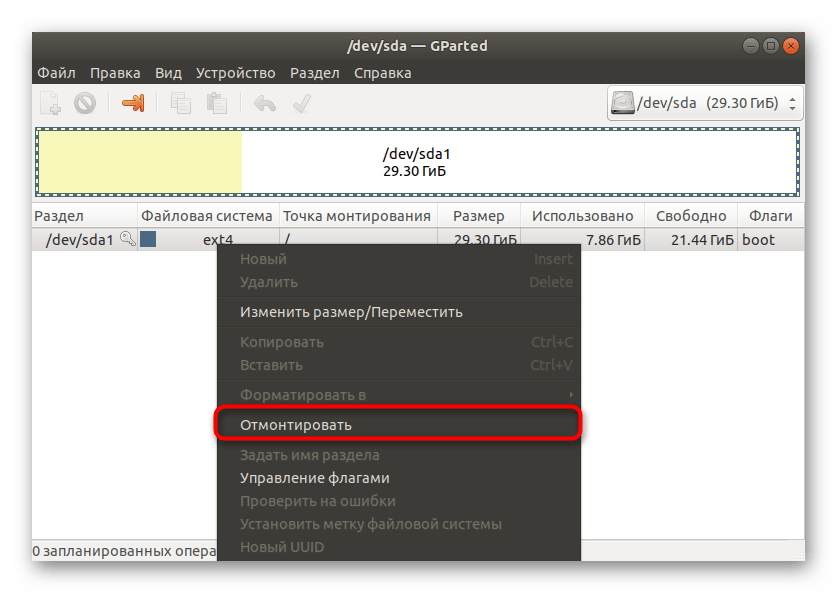 Выделяем мышкой информационную строку с характеристиками флешки. В верхней панели инструментов нажимаем область «Раздел» разворачивая список действий. Выбираем «Отмонтировать», чтобы отключить флешку от файловой системы Linux.