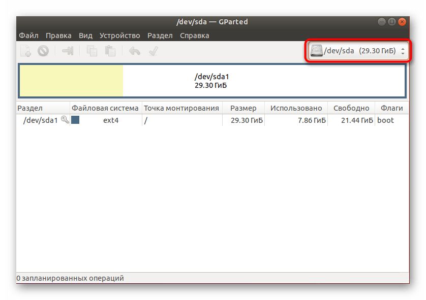 В главном окне разворачиваем меню, указанное стрелкой, и выбираем устройство «/dev/sdb».
