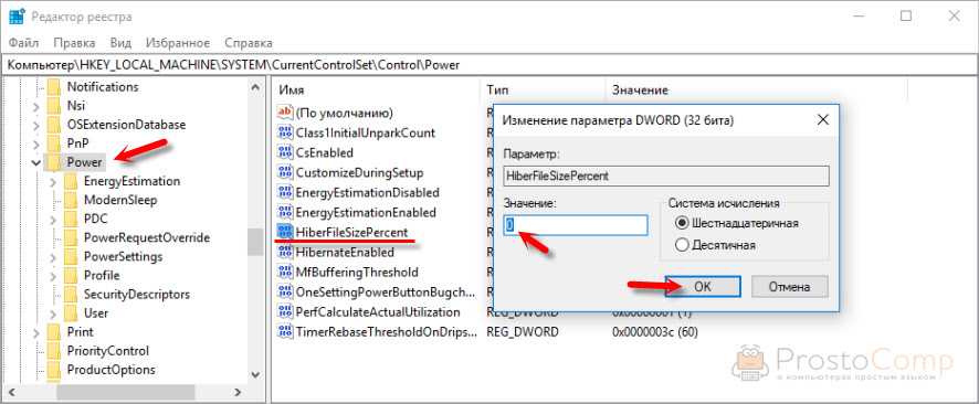 Переходим в HKEY_LOCAL_MACHINE так же щёлкаем по строчке SYSTEM строчкам CurrentControlSet далее Control и Power. В открывшемся окне находим параметр «HiberFileSizePercent», щёлкаем на него. Меняем значения в параметре DWORD на «0». Жмём «ОК».