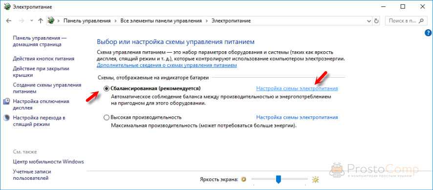 - Напротив выбранной и работающей сейчас схемы питания, которая отмечена соответствующим флажком, нужно нажать на пункт «Настройка схемы питания»;