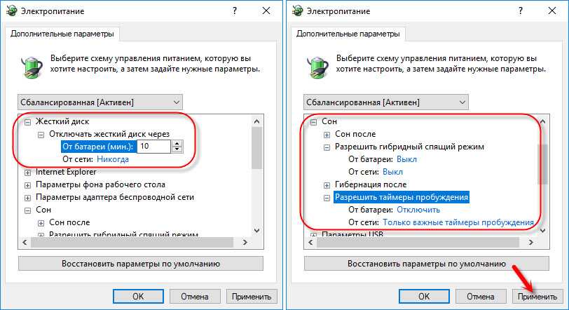 В разделе «Сон» жмём «Разрешить гибридный спящий режим». Выбираем нужное вам значение, то есть «Включить» или «Выключить». В этом же разделе нажимаем «Разрешить таймеры пробуждения». Выбираем «Отключить», «Включить» или «Включить только важные».