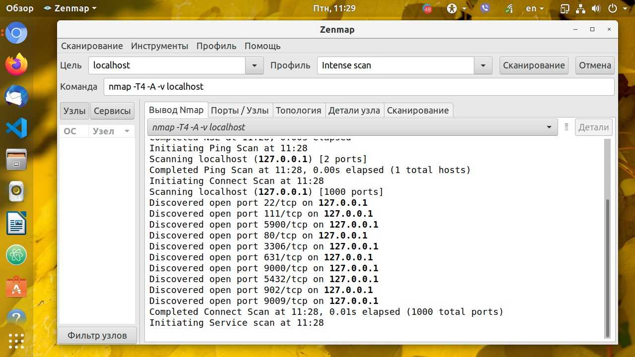 Следующая команда, запущенная с консоли, определяет, какие порты ждут TCP-соединений из сети: nmap -sT -O localhost