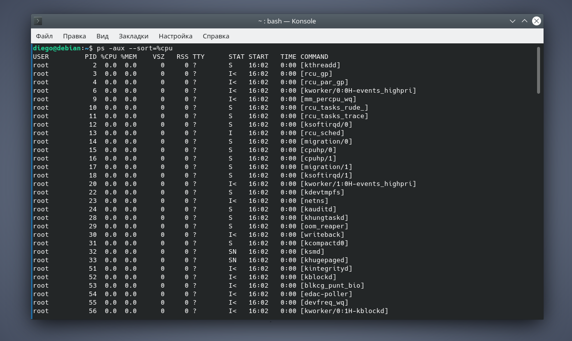 Например, чтобы отсортировать список процессов по потреблению ресурсов процессора (в порядке возрастания), введите команду: