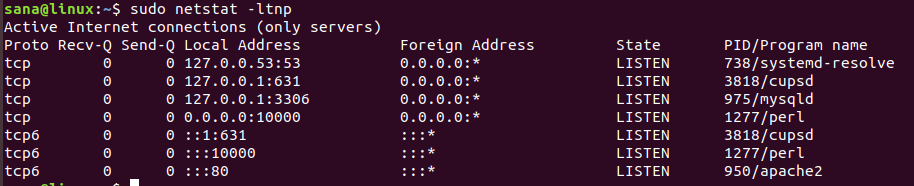 Netstat или утилита статистики сети используются для просмотра информации, связанной с сетевыми соединениями. Это включает информацию об интерфейсной статистике, таблицах маршрутизации и многое другое. Эта утилита доступна в большинстве систем Linux, таким образом давайте используем ее для просмотра информации, о котором портах определенные процессы используют в системе.