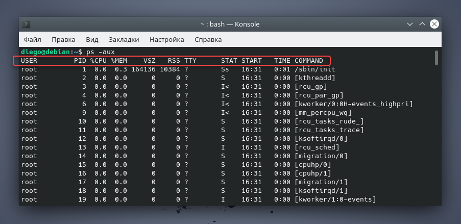 Обратите внимание на выделенный заголовок. Команда поддерживает функцию сортировки процессов по соответствующим столбцам