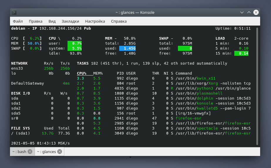 Команда glances — это относительно новый инструмент мониторинга системы с расширенными функциями: