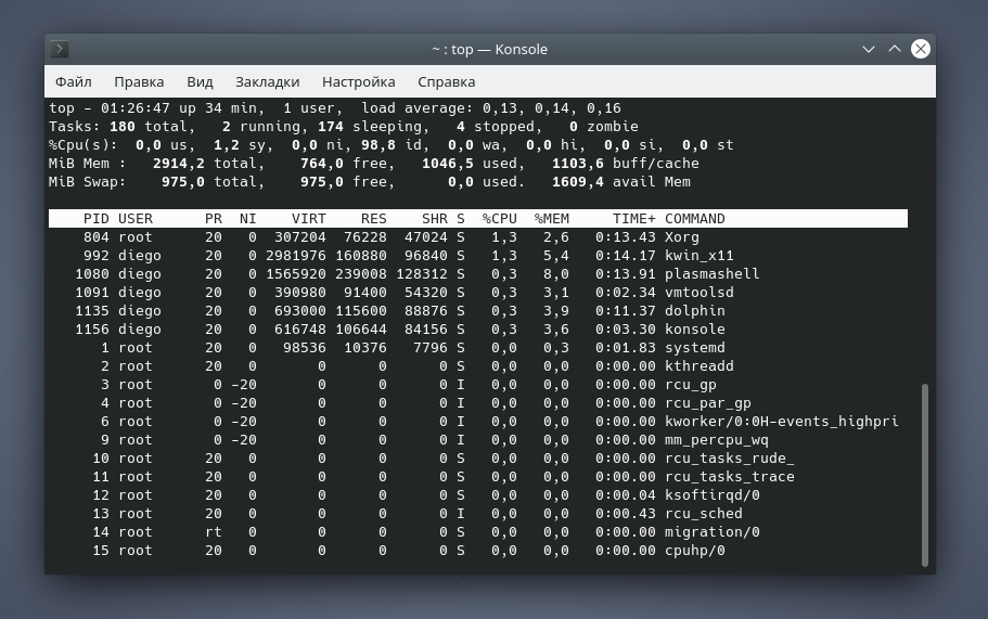 Команда top отображает информацию о запущенных процессах в режиме реального времени: