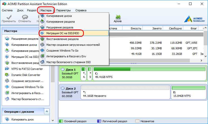 Итак, место под перенос Windows подготовлено. Теперь можно приступать к основной операции. Жмём меню «Мастера». Выбираем функцию миграции.