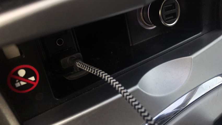 - Подключить шнур к разъему 3,5 мм на Айфоне и к электрической сети транспортного средства через прикуриватель соответственно;