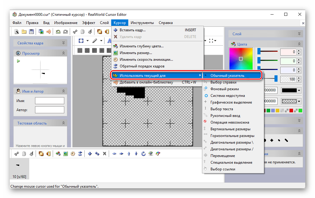 Создайте собственный графический примитив в редакторе и в разделе «Курсор» кликните по пункту «Использовать текущий для -> Обычный указатель».