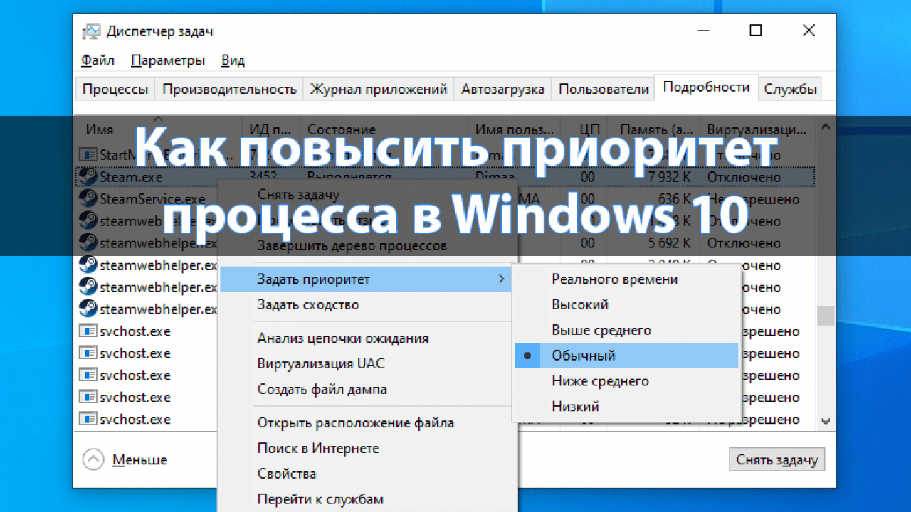 По умолчанию всем процессам выставляется обычный приоритет в Windows 10. Можно понизить или повысить приоритет отдельного процесса, в независимости от конкретного приложения или игры. Доступны следующие основные значения приоритетов: реального времени, высокий, обычный и низкий и промежуточные значения: выше среднего и ниже среднего.