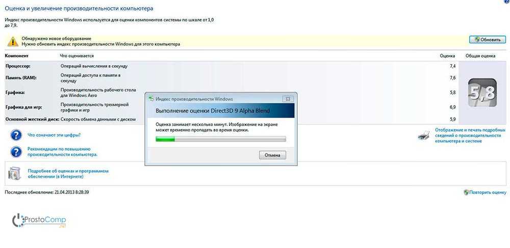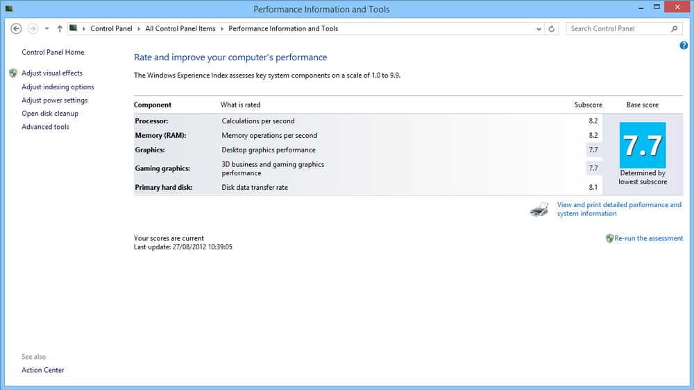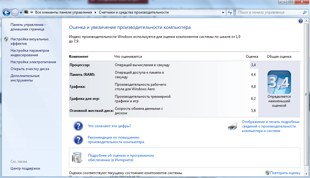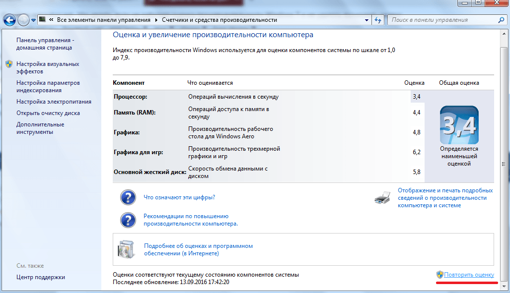 Если отдельная программа или работа системы Windows 7 требует более высокого значения, чем имеющееся базовое значение вашего компьютера, можно повысить это значение, обновив оборудование. Чтобы проверить, не изменилось ли базовое значение после установки нового оборудования, выберите Повтор оценки. Чтобы больше узнать об оборудовании на компьютере, выберите Просмотреть и распечатать подробности.