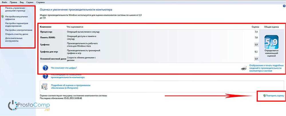 Снизу сделайте клик по кнопке «Повторить оценку». Программа начнет анализировать продуктивность вашей системы и по завершению выдаст результаты, по которым можно будет сделать вывод о быстродействии компьютера.