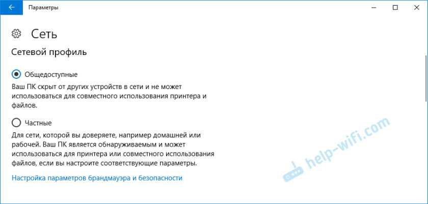 Вместо настройки сетевого профиля может быть пункт «Сделать этот компьютер доступным для обнаружения». Если поставить переключатель в положение «Откл», то компьютер не будет обнаруживаться в сети (Общедоступная сеть). А если поставить «Вкл», то будет применен профиль «Частная сеть».
