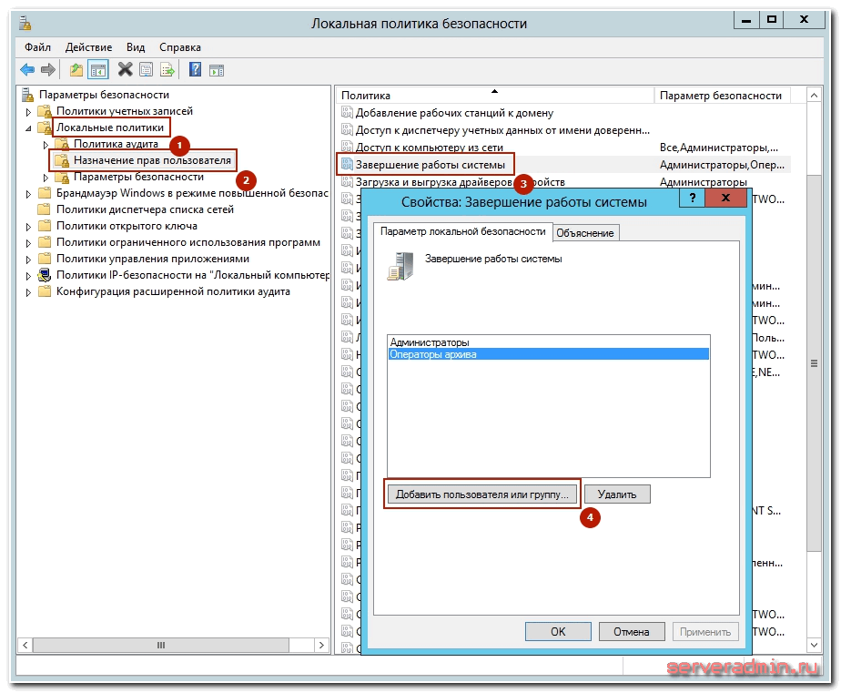 Сохраняем файл и создаем пользователя, под которым будем выключать сервер. Не забудьте добавить этому пользователю разрешение подключаться по rdp. Если вы выключаете компьютер с десктопной системой, то прав обычного пользователя достаточно. Если же вам надо погасить Windows Server, то пользователя нужно либо сделать админа, либо дать ему права на разрешение выключение сервера через локальную политику безопасности. Живет эта политика по адресу — параметры безопасности — локальные политики — назначение прав пользователей — завершение работы системы.