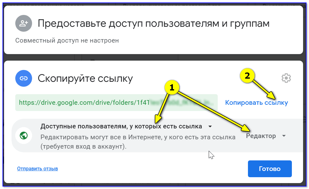 Далее разрешаете к ней доступ тем пользователям, у кого есть ссылка, и ставите режим доступа «Редактор» (т.е. они смогут делать в этой папке, что захотят. ).