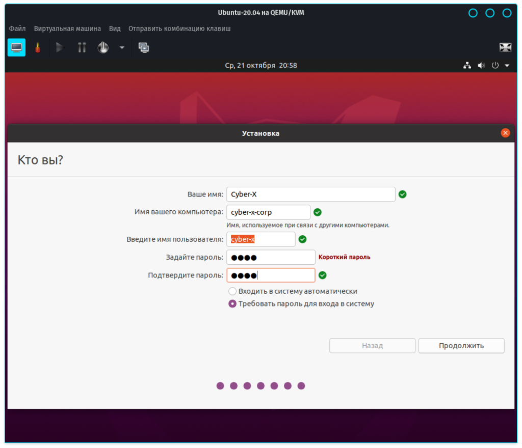 Создадим вашего пользователя, под которым вы и будете входить в установленную систему. Тут все достаточно просто, заполняем соответствующие поля и нажимаем “Продолжить”. В поле “Ваше имя” вписываем ваш ник, или ваше имя – по желанию. Задаем имя компьютера, вписываем пароль два раза и при необходимости ставите отметку “Входить в систему автоматически”, то есть, при включении компьютера вам не надо будет вводить пароль:
