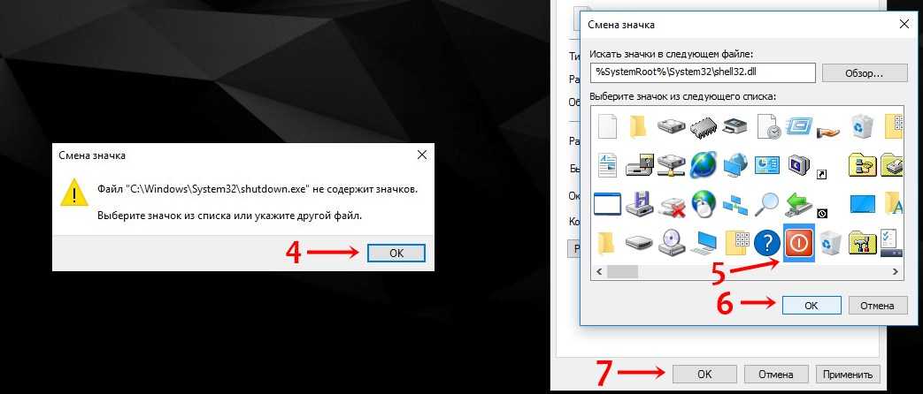 И в очередном окне выбираем значок который вам понравится. Я, не мудрствуя лукаво, выбрал значок обозначающий как раз выключение.
