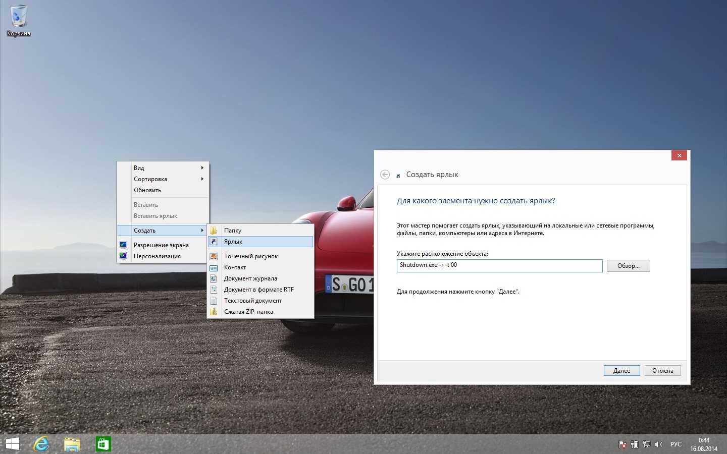 Создадим ярлык выключения на рабочем столе, но вы также сможете перенести его на панель задач.