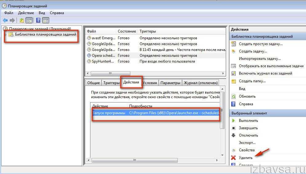6. Проанализируйте все объекты, отображённые в списке планировщика. Подозрительные и опасные удалите (ориентируйтесь по названию вирусного сайта и исполняемым файлам, найденным в реестре): клик правой кнопкой → директива «Удалить».