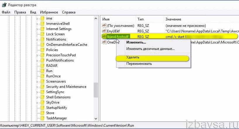 4. В правой панели, где отображены все записи, находящиеся в директории Run, нейтрализуйте ключи, которые: