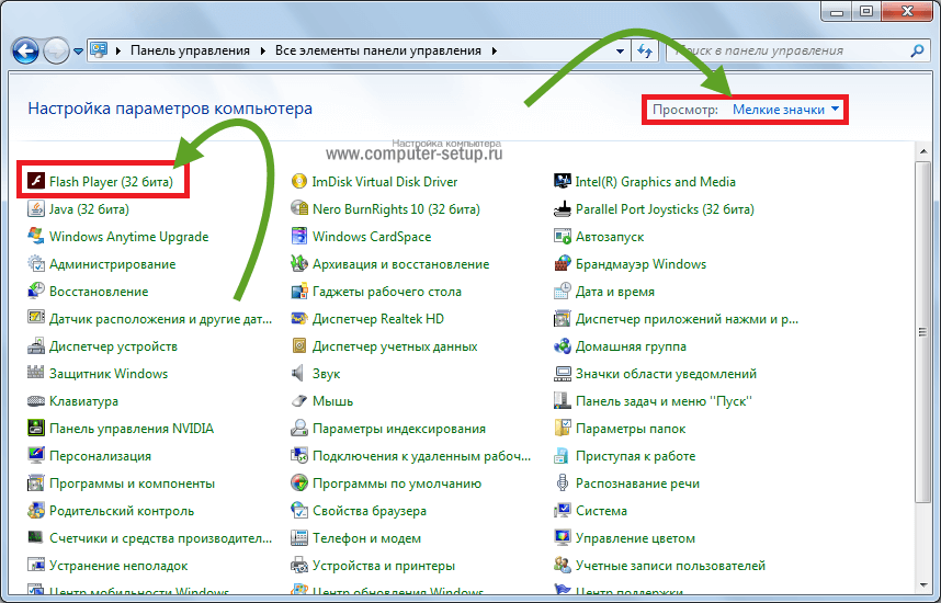 2В списке программ нажмите на Flash Player (32 бита). Обычно он находится в левом верхнем углу списка. Если у вас семерка, все будет выглядеть так, как показано на рисунках ниже.