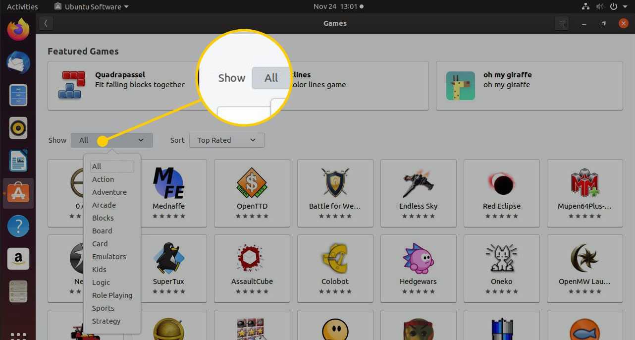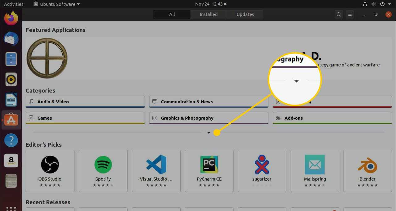 Если вы хотите увидеть, что доступно в репозиториях, разверните список категорий на вкладке Все программное обеспечение . Затем выберите стрелку раскрывающегося списка в центре экрана под списком популярных категорий. Список расширяется, чтобы показать полный набор доступных категорий.