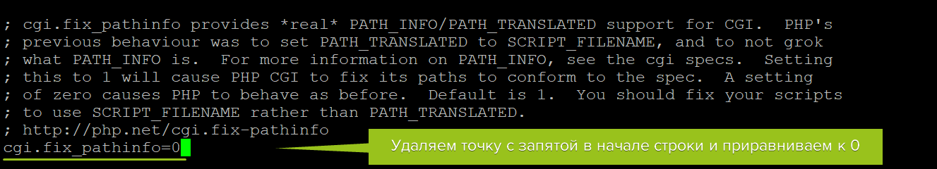 В файле ищем раздел Paths and Directories (он почти в самом конце файла), внутри находим параметр cgi.fix_pathinfo. Нужно раскомментировать его (удалить «;» в начале строки) и изменить значение с «1» на «0».