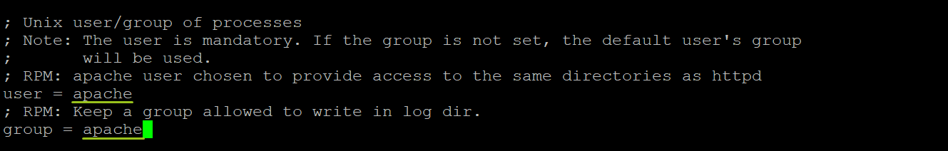 В файле ищем блок кода Unix user/group of processes и меняем apache на www-data для Debian и Ubuntu и nginx для CentOS.