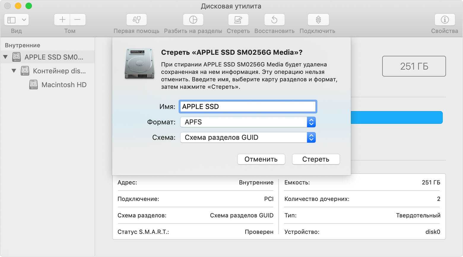 - Имя диска: название тома может быть любым. По умолчанию используется Macintosh HD.