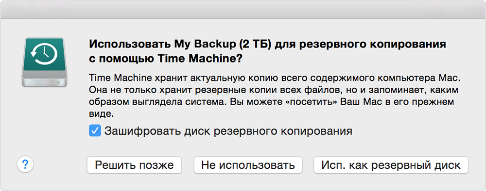Если внешний диск уже был отформатирован, приложение Time Machine даст «добро» на его использование. Подтвердите запрос.