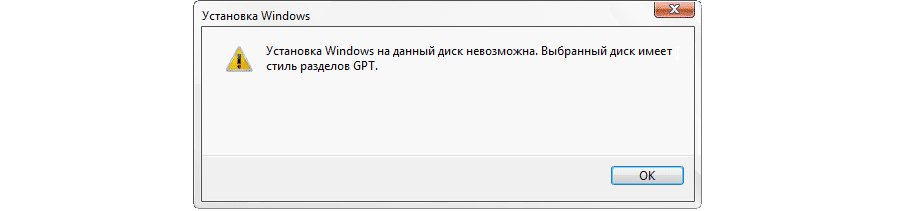 С проблемами при установке на диск с разметкой разделов GPT чаще сталкиваются те пользователи, которые устанавливают Windows 7, но и в 8-й версии можно получить ту же самую ошибку с текстом о том, что установка на данный диск невозможна. Также, такая ситуация может возникать, если после установки Windows 8 на компьютер, Вы решите перейти на Windows 7, при установке которой Вы также получите ошибку:
