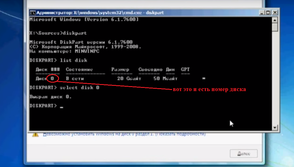 - diskpart – запуск утилиты для работы с разделами;