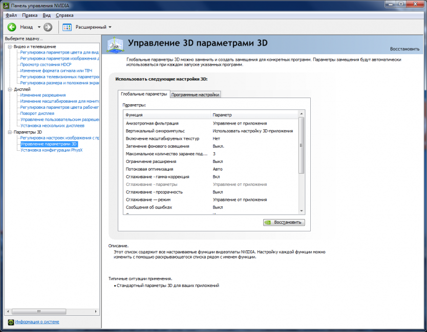 Если же вас что-то в данном параметре не устраивает — перейдите в пункт, отвечающий за управление параметрами 3D. В правой части окна панели управления NVIDIA откроются все его параметры.