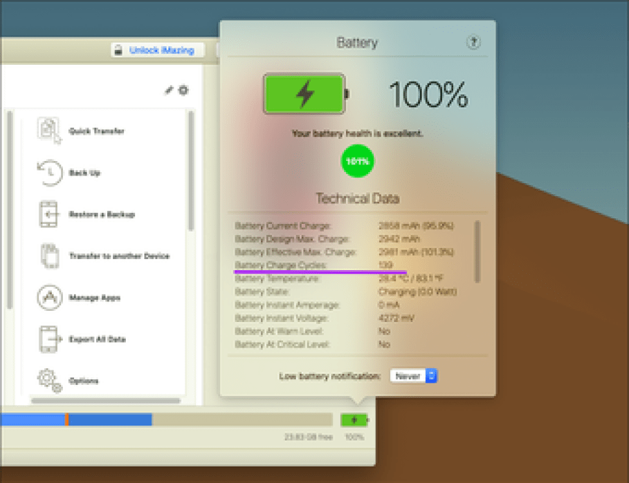 iMazing поддерживает как macOS, так и Windows. Это инструмент управления iPhone, который можно использовать для выполнения множества задач — создания резервных копий, доступа к фотографиям, передачи музыки и т. Д. Хотя вы должны платить за использование большинства функций iMazing, вы можете проверить статистику заряда батареи на своем iPhone, включая количество циклов зарядки, бесплатно.
