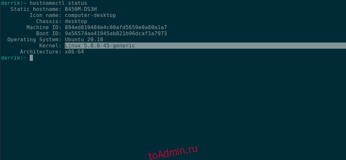 Другой способ узнать версию ядра Ubuntu — использовать Hostnamectltool. Это инструмент systemd, который позволяет пользователям находить информацию о системе. Его можно использовать для просмотра вашей версии ядра Ubuntu. Вот как.