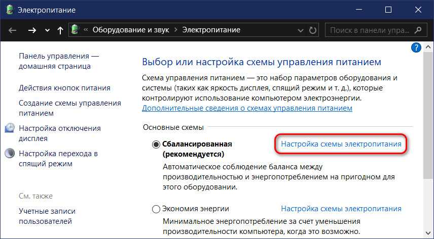 Около выбранной схемы электропитания щелкните по кнопке «Настройка схемы электропитания».