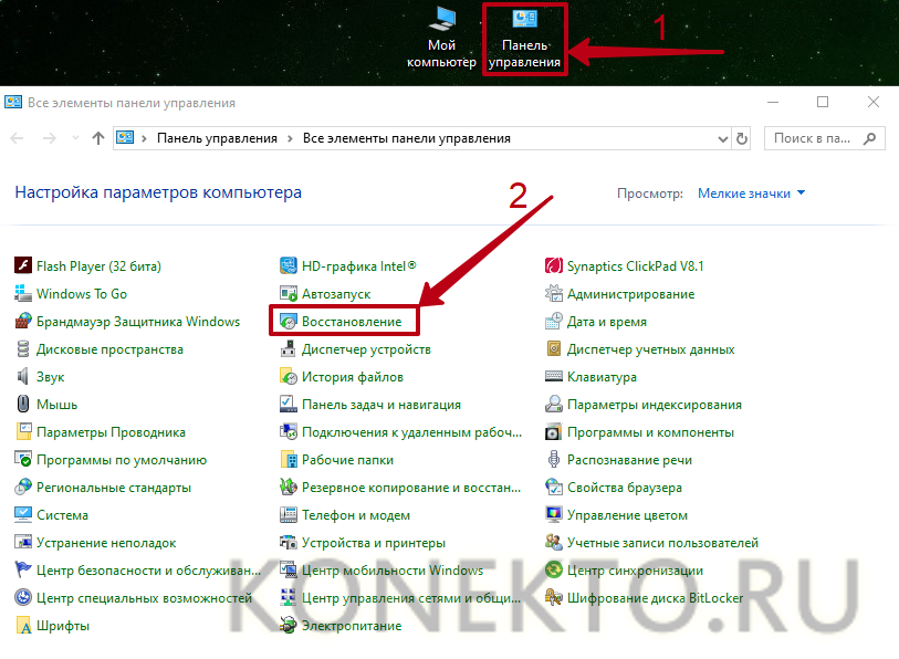 Войти в «Панель управления» и выбрать пункт «Восстановление».