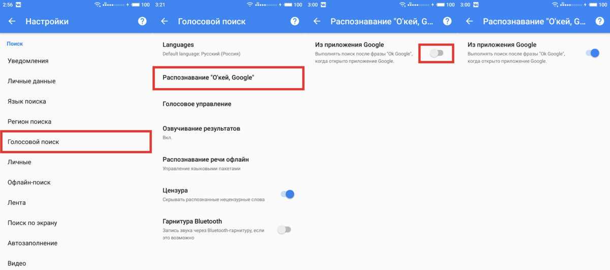 - Настройки -> Голосовой поиск -> Распознавание «О’кей Google».