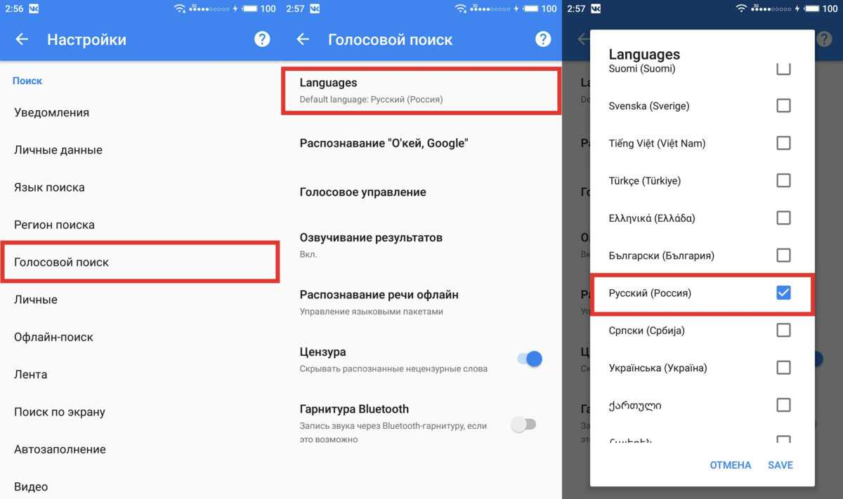 Перейдите в приложение Google, а затем в главное меню, затем откройте «Настройки» > «Голосовой поиск», а затем выберите пункт «Русский (Россия)» из меню «Languages».