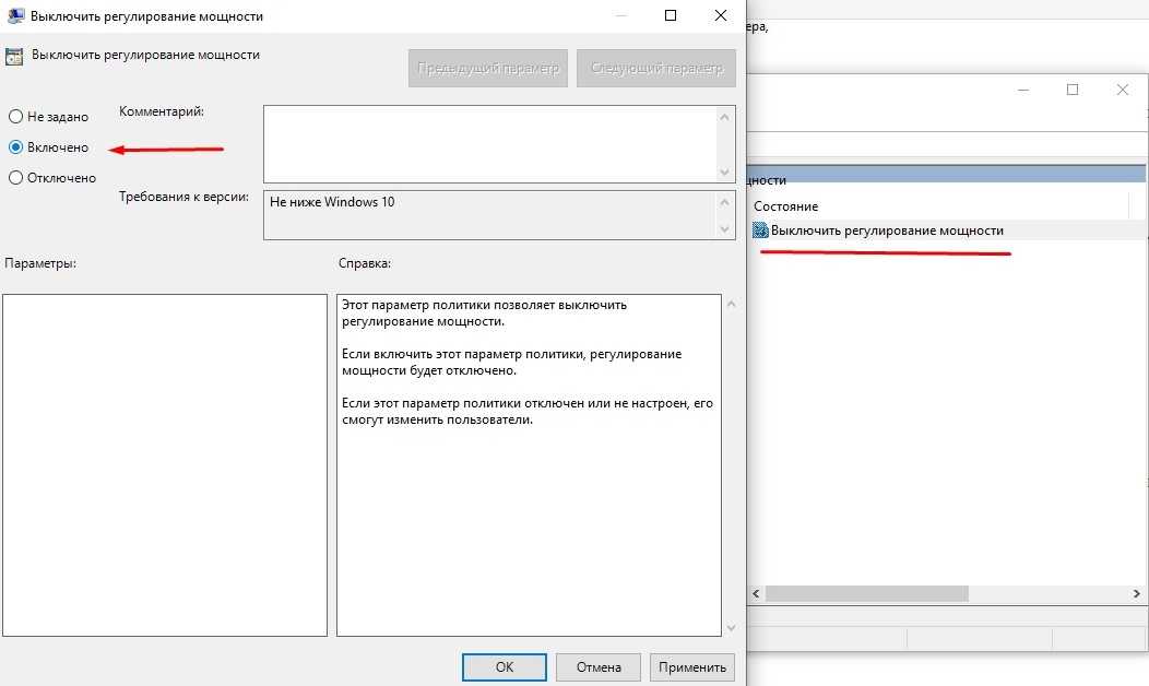 - Двойным щелчком ЛКМ откройте политику «Выключить регулирование мощности».