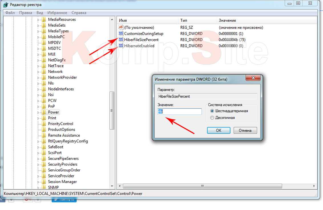 Как изменить записи файлов HiberFileSizePercent и HibernateEnabled в реестре?