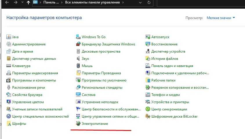 Далее переключаем вид на Мелкие значки и ищем пункт Электропитание.